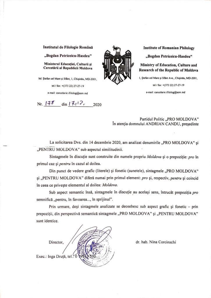 Potrivit formațiunii, sintagma „Pentru Moldova”, utilizată de un grup de deputați și o fracțiune parlamentară, este identică, din punct de vedere semantic, cu denumirea partidului PRO MOLDOVA, fapt certificat de Institutul de Filologie Română „Bogdan Petriceicu-Hașdeu”, din cadrul Ministerului Educației, Culturii și Cercetării.
