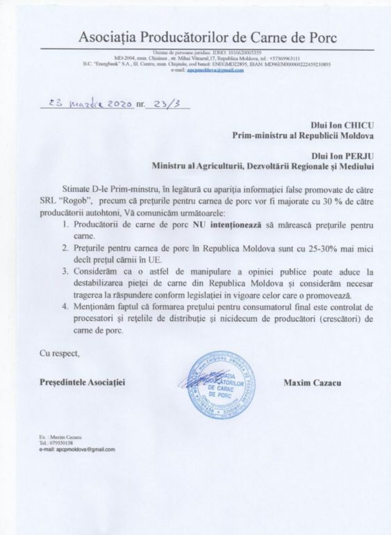 Astfel, în legătură cu apariția informației false promovate de către o companie de la noi, precum că prețurile pentru carnea de porc vor fi majorate cu 30% de către producătorii autohtoni, aceștia s-au văzut nevoiți să trimită o scrisoare în adresa premierului Ion Chicu și a ministrului Agriculturii.