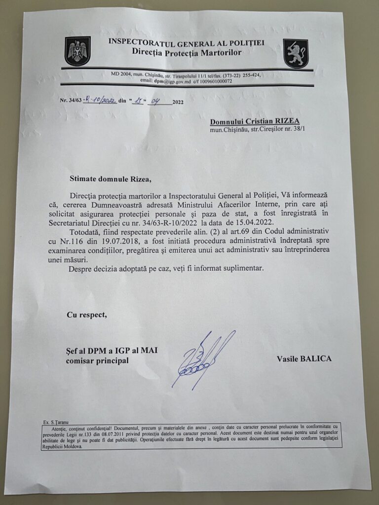 ”Cu privire la informațiile apărute în unele surse mass media și rețele de socializare, precum că un cetățean român, aflat pe teritoriul Republicii Moldova, ar fi primit protecție din partea Inspectoratului General al Poliției, prin prisma Legii nr. 105 cu privire la protecția martorilor și altor participanți la procesul penal, IGP precizează că persoanei vizate i-a fost respinsă solicitarea, pe motiv de neîntrunire a condițiilor specificate în art. 23 a legii menționate, iar despre decizia adoptată, persoana a fost înștiințată în scris”, a comunicat în această dimineață conducerea IGP, încercând să dezmintă declarația lui Cristian Rizea despre paza pe care urmează să o primească de la MAI.