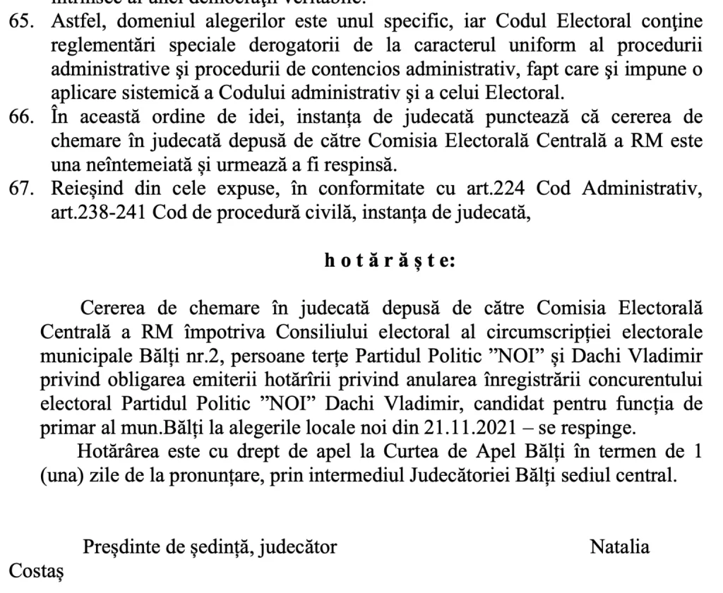 Judecătorii de la Bălți au respins solicitarea CEC de a-l scoate pe Vladimir Dachi, reprezentantul Partidului ”NOI” din cursa electorală de la Bălți pentru aproximativ aceleași încălcări care i se impută acum și Marinei Tauber.