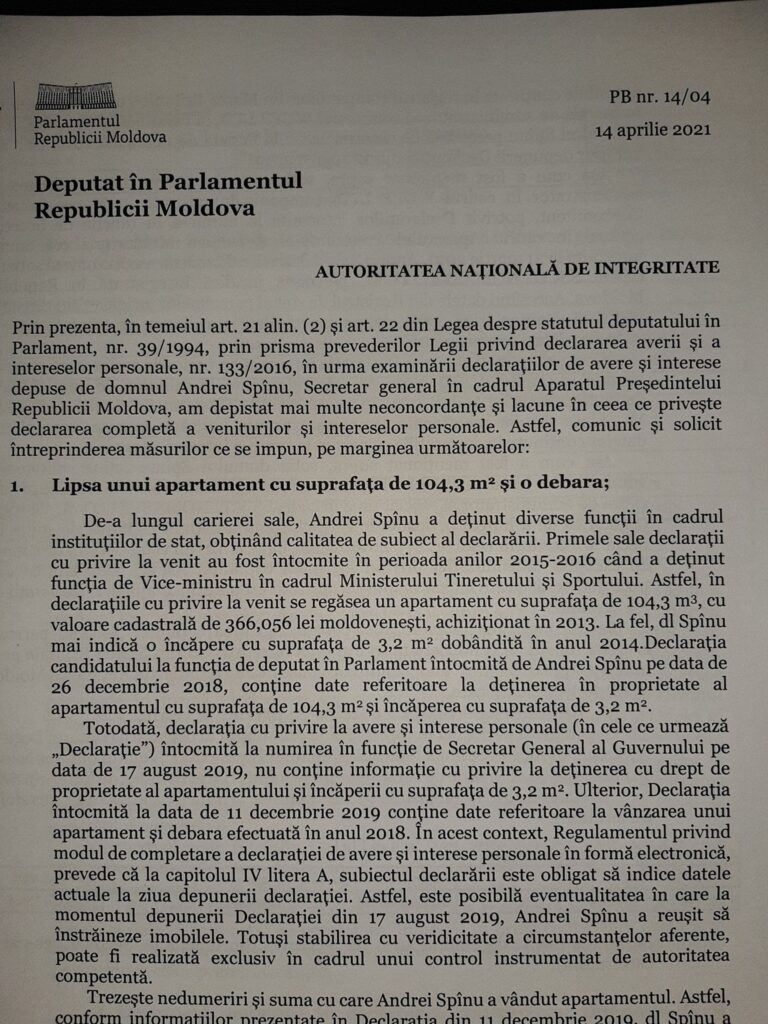 ”Promovat de PLDM în funcția de vice-ministrul Tineretului și Sportului, în 2015-2016, tânărul de puțin peste 20 de ani trecuți a declarat un apartament cu suprafața de 104,3 m.p., cu valoare cadastrală de 366,056 lei, achiziționat în 2013. Tot atunci Spînu a mai indicat o încăpere cu suprafața de 3,2 m2 dobândită în anul 2014. Aceleași informații se conțin și în declarația lui în calitate de candidat la funcția de deputat în Parlament întocmită pe data de 26 decembrie 2018. Însă declarația cu privire la avere și interese personale întocmită la numirea în funcție de Secretar General al Guvernului pe data de 17 august 2019, nu mai conține informație cu privire la deținerea cu drept de proprietate al apartamentului și încăperii cu suprafața de 3,2 m2. La sfârșitul anului Spînu a indicat date referitoare la vânzarea unui apartament și debara efectuată în anul 2018. Andrei Spînu a încălcat astfel modul de completare a declarației, când a omis aceste informații, despre vânzarea imobilelor.