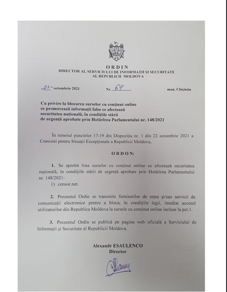Comisia pentru Situații Excepționale a impus cenzură asupra informațiilor despre criza gazelor naturale din Republica Moldova. Potrivit deciziei din 22 octombrie, „furnizorii de servicii de găzduire a conținutului online și furnizorii de conținut online de pe teritoriul Republicii Moldova sunt obligați ca, la decizia Serviciului de Informații și Securitate al Republicii Moldova, să întrerupă imediat, cu informarea publicului, transmiterea într-o rețea de comunicații electronice ori stocarea conținutului, prin eliminarea acestuia la sursă, dacă prin conținutul respectiv se promovează informații false ce afectează securitatea națională, în condițiile stării de urgență aprobate prin Hotărârea Parlamentului nr. 148/2021. Serviciul de Informații și Securitate al Republicii Moldova va aproba prin ordin și va face publică lista surselor cu conținut online care promovează informații false ce afectează securitatea națională în condițiile de stării de urgență aprobate de către Parlament”.