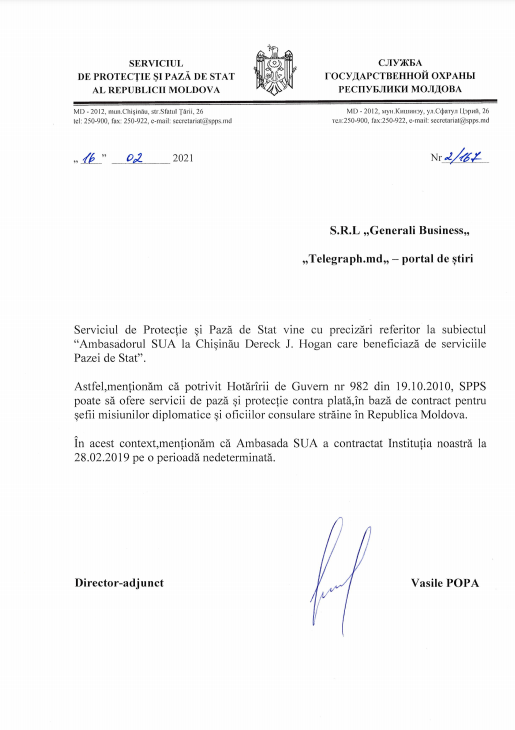 Printr-o scrisoare expediată redacției Telegraph.md, SPPS a venit cu precizări referitor la subiectul despre bodyguarzii de stat pentru Dereck J. Hogan, Ambasadorul SUA la Chișinău, menționând că Ambasada SUA ar fi contractat serviciile de protecție şi pază de corp la 28 februarie 2019 pe o perioadă nedeterminată. Totuși, Serviciul nu a precizat și suma încasată pentru ofițerii puși la dispoziția diplomatului american.