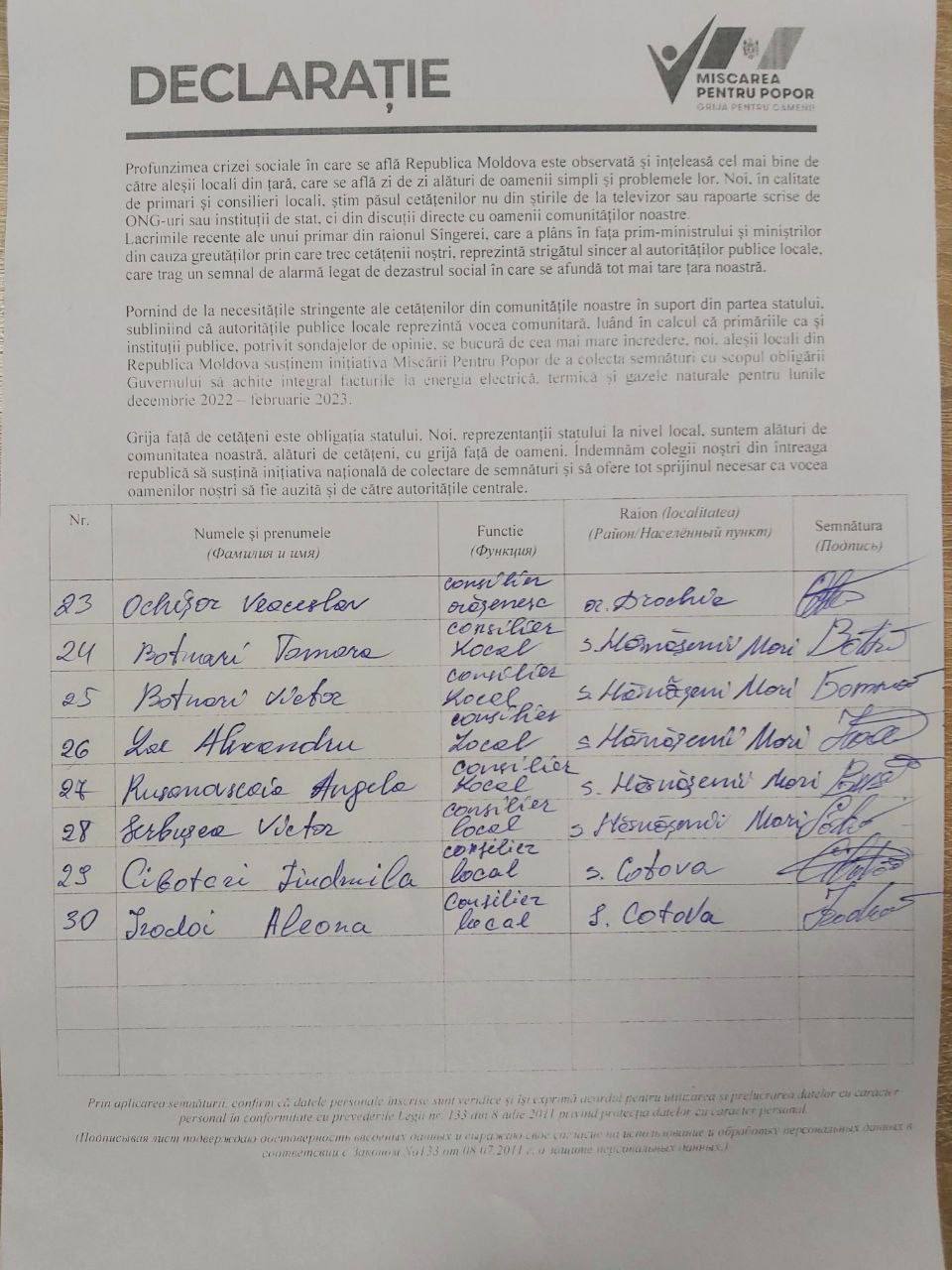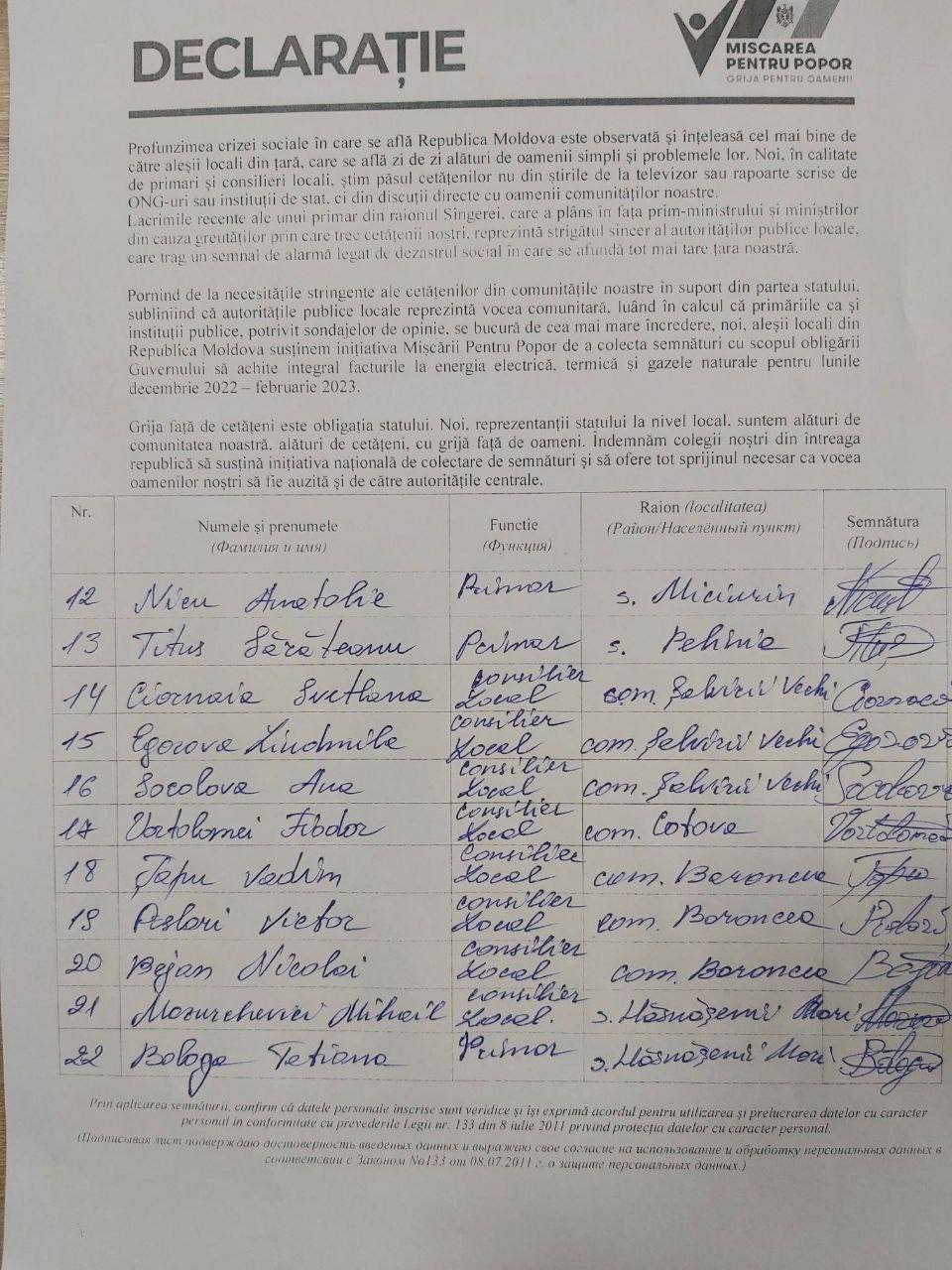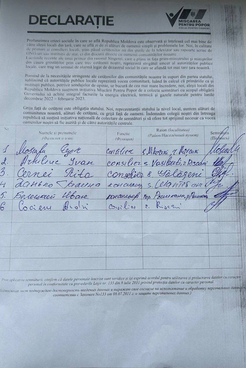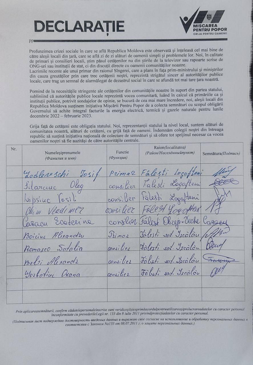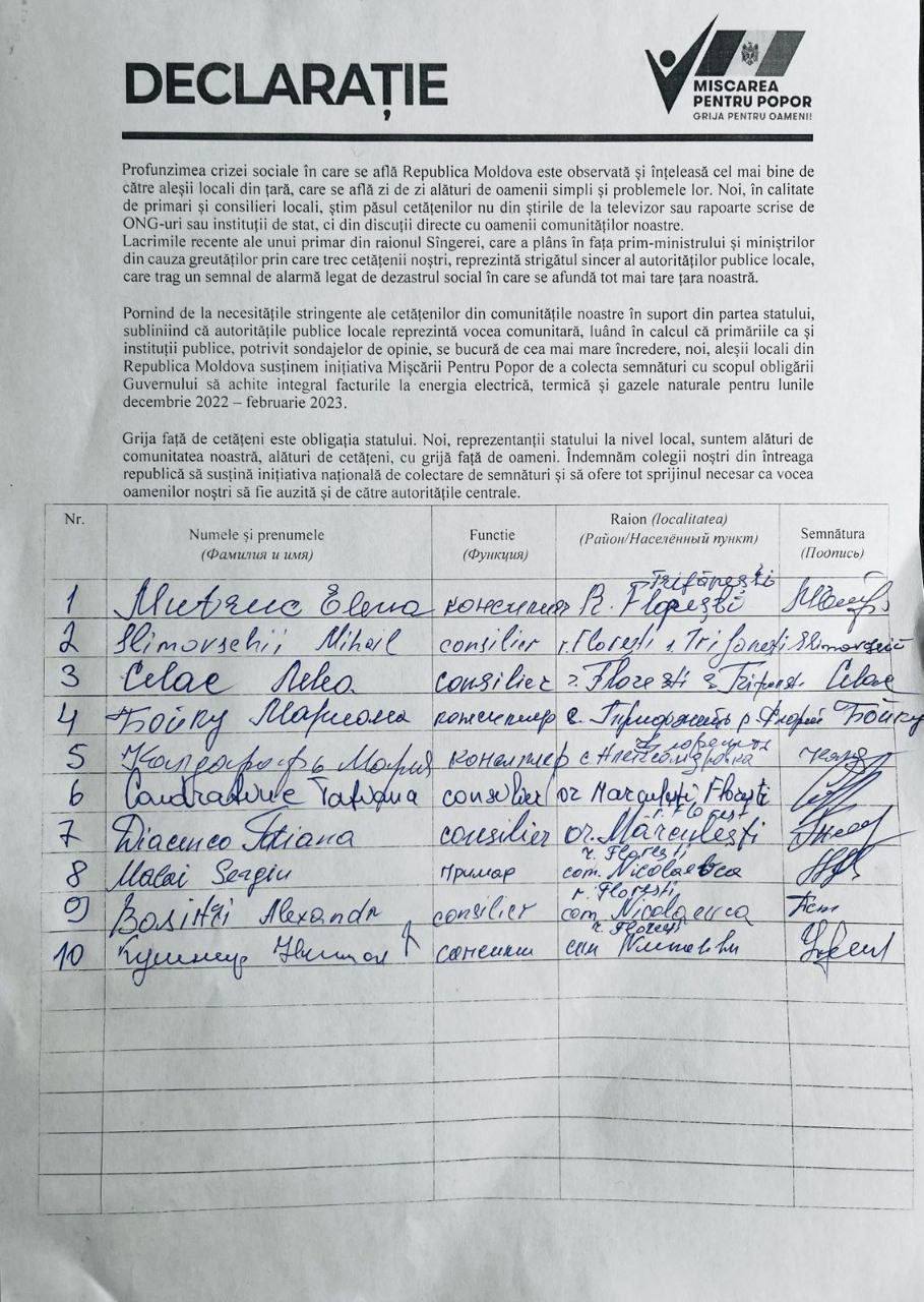 De asemenea, aleșii locali subliniază că grija față de cetățeni este obligația statului. „Noi, reprezentanții statului la nivel local, suntem alături de comunitatea noastră, alături de cetățeni, cu grijă față de oameni. Îndemnăm colegii noștri din întreaga republică să susțină inițiativa națională de colectare de semnături și să ofere tot sprijinul necesar pentru ca vocea oamenilor noștri să fie auzită și de către autoritățile centrale”, se mai menționează în declarația comună a aleșilor locali în sprijinul „Mișcării Pentru Popor”.