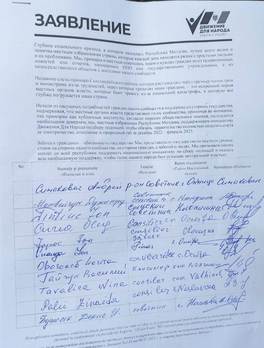 Sute de aleși locali și-au exprimat sprijinul pentru „Mișcarea Pentru Popor”, lansată săptămâna trecută cu scopul de a determina Guvernul să plătească integral facturile pentru resursele energetice în perioada lunilor de iarnă. Într-o declarație comună, semnată de președinți de raion, primari, consilieri raionali și locali, se menționează că profunzimea crizei sociale în care se află Republica Moldova este observată și înțeleasă cel mai bine de către aleșii locali din țară, care se află zi de zi alături de oamenii simpli și problemele lor.