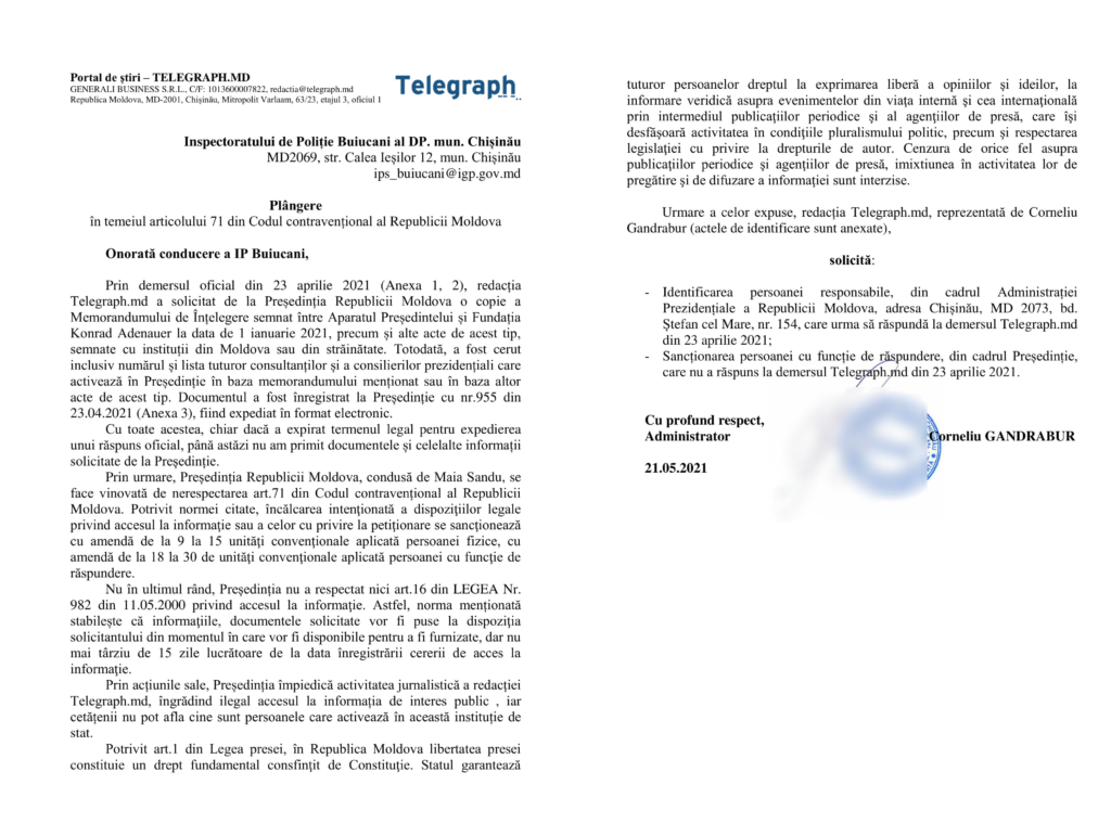 Prin demersul oficial din 23 aprilie 2021, redacția Telegraph.md a solicitat de la Președinția Republicii Moldova o copie a Memorandumului de Înțelegere semnat între Aparatul Președintelui și Fundația Konrad Adenauer la data de 1 ianuarie 2021, precum și alte acte de acest tip, semnate cu instituții din Moldova sau din străinătate. Totodată, a fost cerut inclusiv numărul și lista tuturor consultanților și a consilierilor prezidențiali care activează în Președinție în baza memorandumului menționat sau în baza altor acte de acest tip. Demersul a fost înregistrat la Președinție cu nr.955 din 23.04.2021, fiind expediat în format electronic.