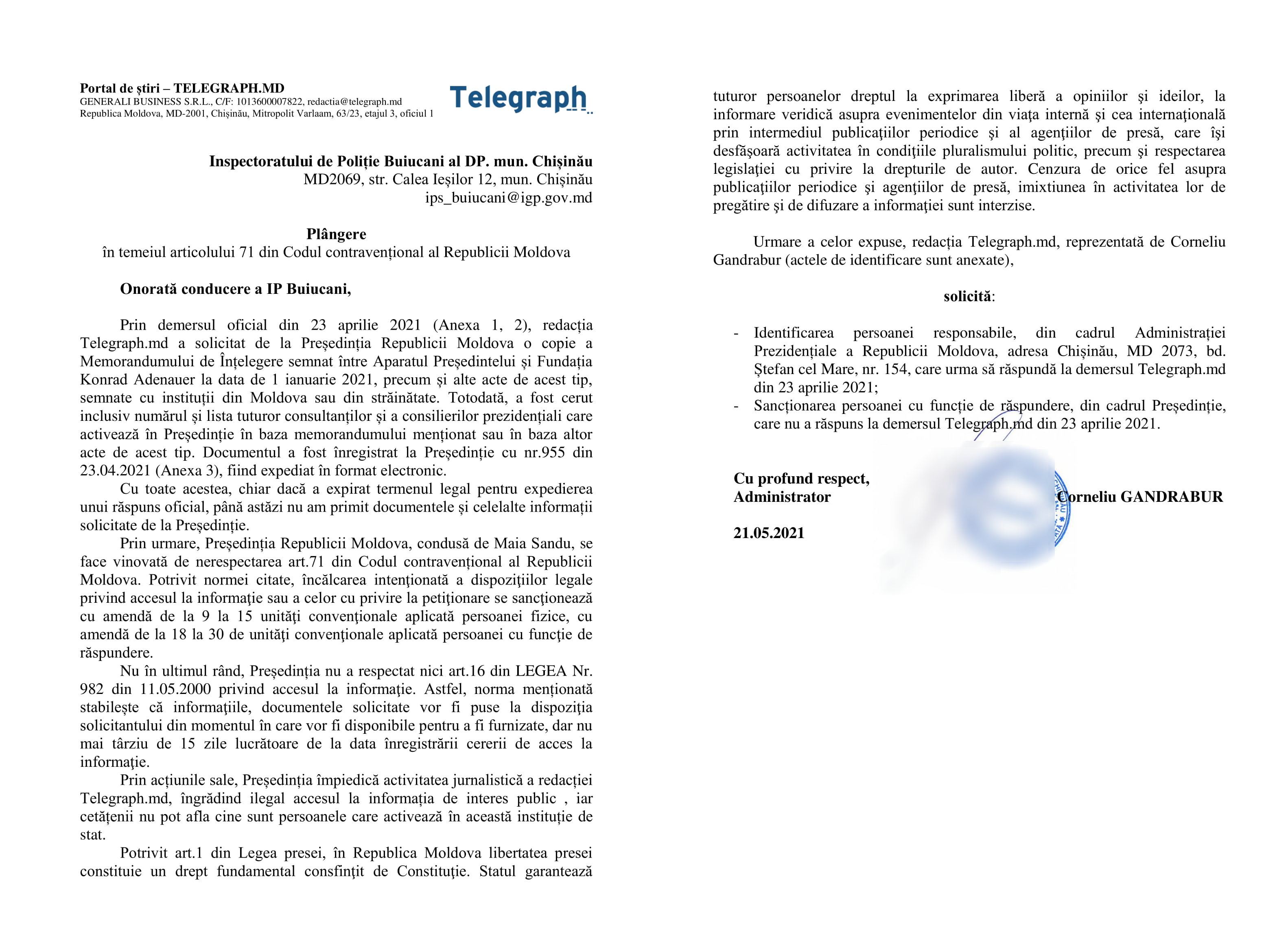 Urmare a celor expuse, redacția Telegraph.md a solicitat Poliției să întreprindă acțiunile necesare în vederea identificării persoanei responsabile, din cadrul Administrației Prezidențiale a Republicii Moldova, adresa Chișinău, MD 2073, bd. Ștefan cel Mare, nr. 154, care urma să răspundă la demersul din 23 aprilie 2021 , cu sancționarea acesteia în ordinea stabilită de legislația în vigoare.