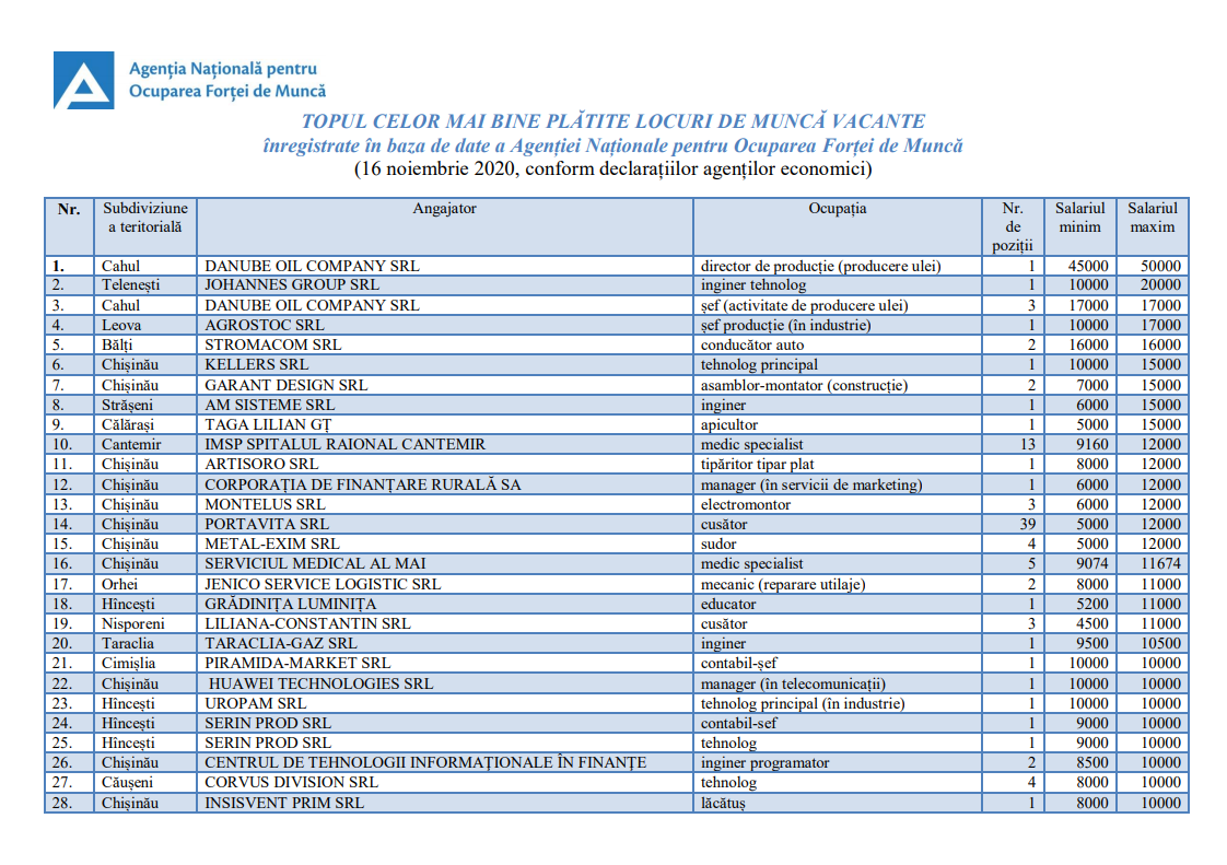 Cel mai plătit loc de muncă vacant declarat la ANOFM este pentru poziția de director de producție la compania elvețiană Danube Oil Company SRL, care își desfășoara activitatea în raionul Cahul, satul Giurgiulești. Locul de muncă este pentru o persoană cu experiență în domeniul exctracției uleiului de floarea soarelui și care cunoaște limba engleză la nivel avansat. Compania oferă un salariu între 45.000 și 50.000 de lei.