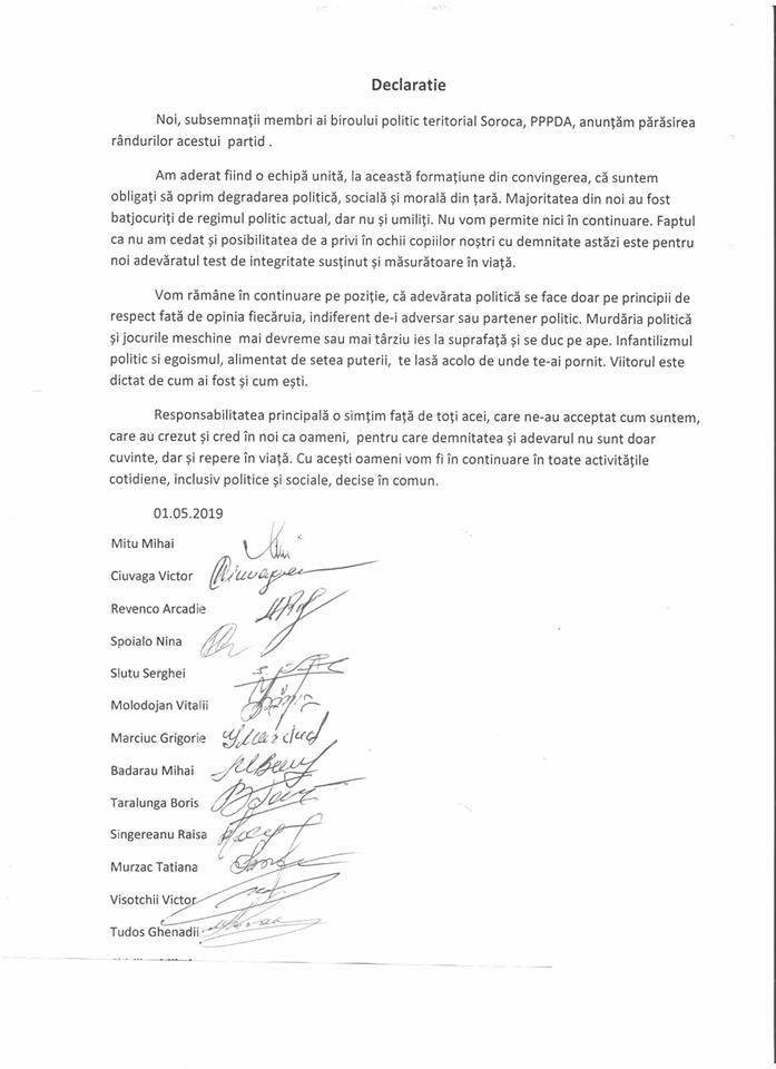 Întregul birou politic al Partidului Platforma Demnitate și adevăr a organizației raionale Soroca, compus din 13 membri a anunțat că părăsesc rândurile partidului. Despre acest lucru, a anunțat, fostul președinte al raionului, Mihai Mâțu, membru al PPDA din 2016.