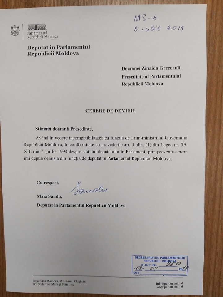 Premierul Maia Sandu a depus astăzi cererea de demisie din funcția de deputat, anunțul a fost făcut de către șeful Executivului cu puțin timp în urmă, prin intermediul unei postări pe o rețea de socializare.