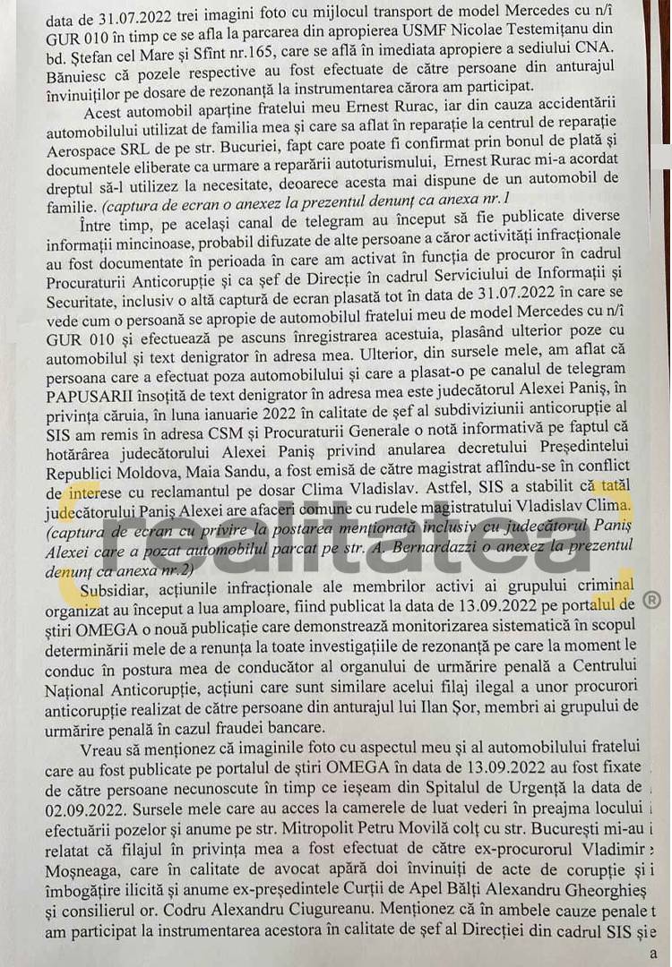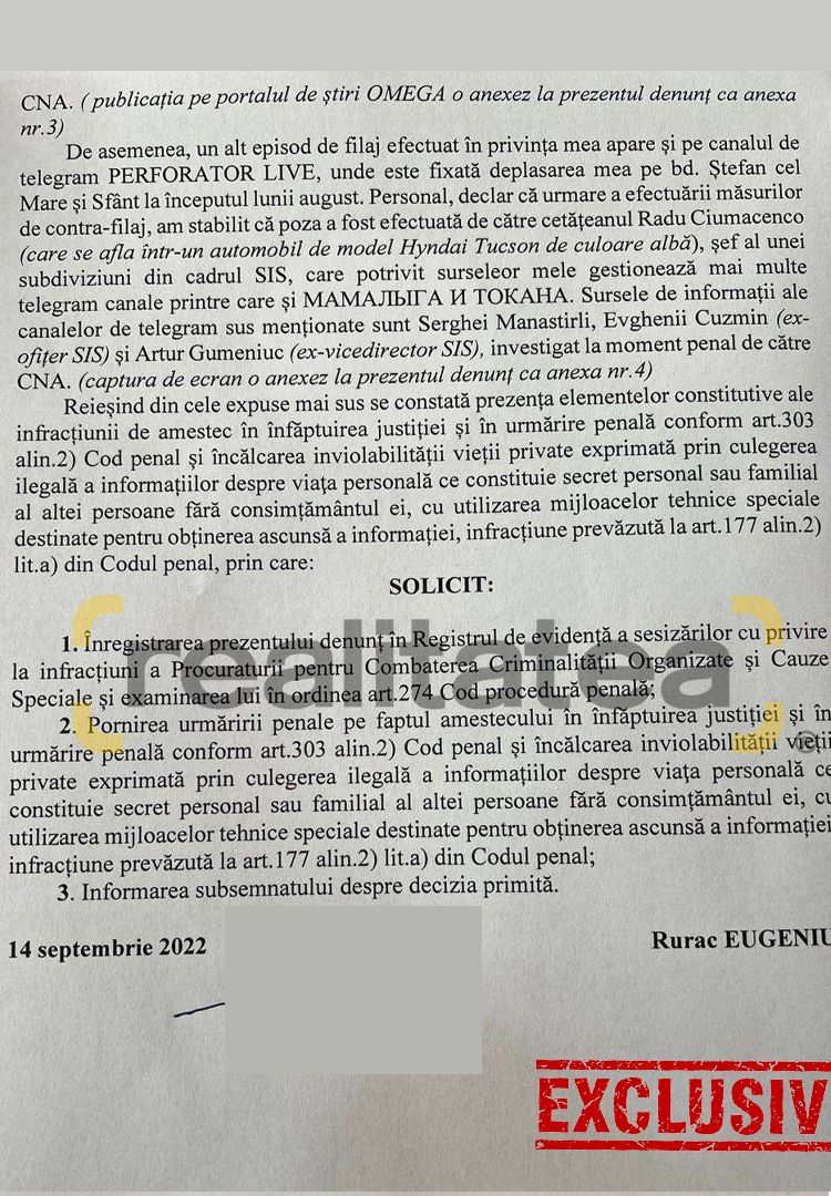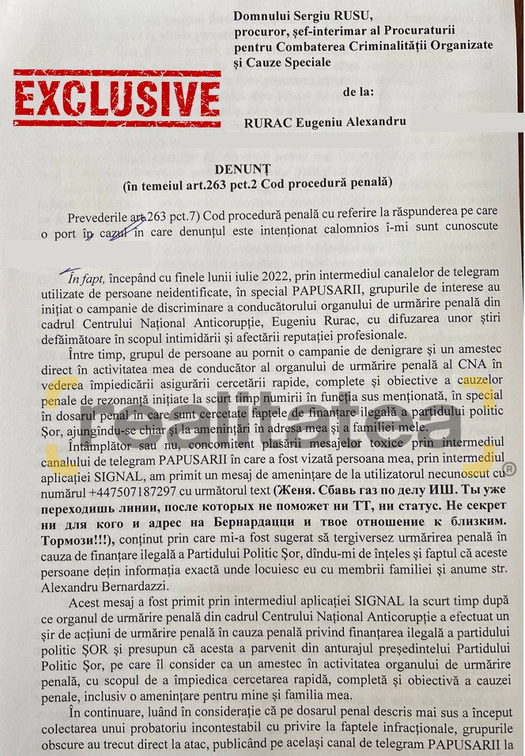”Întâmplător sau nu, concomitent plasării mesajelor toxice, prin intermediul canalului de telegram PAPUSARII (…) am primit un mesaj de amenințare (…) cu următorul text ”Женя. Сбавь газ по делу ИШ. Ты уже переходишь линии”, se arată în denunțul lui Rurac.