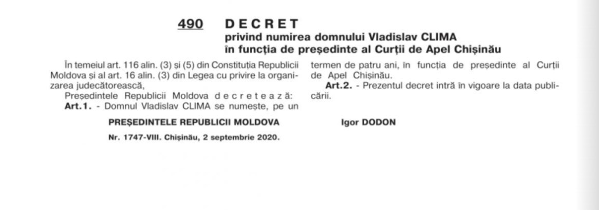 Potrivit documentului, Vladislav Clima va deține un mandat de 4 ani.