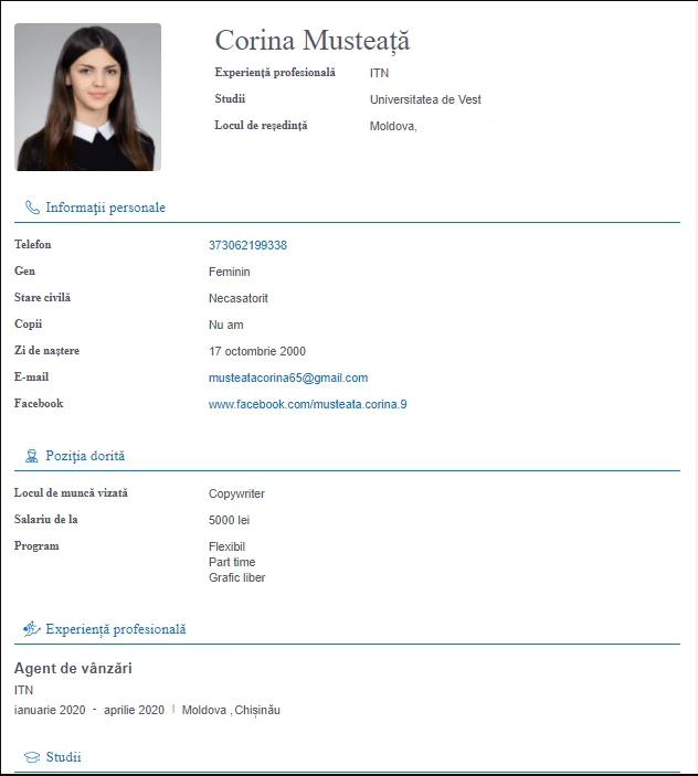 Conform unuii CV plasat pe un site de joburi, Corina Musteață ar fi activat în calitate de agent de vânzări, iar în ultima perioadă aceasta se dorea copywriter și cerea un salariu de 5000 de lei.