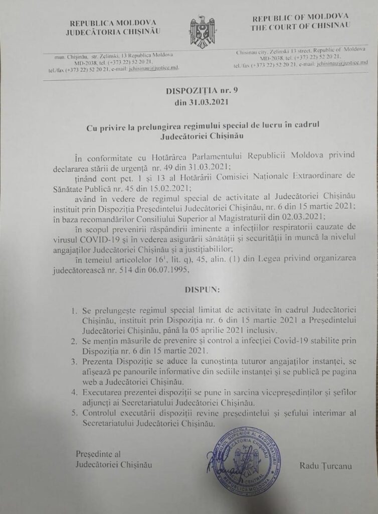 A fost prelungit regimul special de activitate a Judecătoriei Chișinău, informează Telegraph.md, cu referire la dispoziția semnată de către președintele instanței.