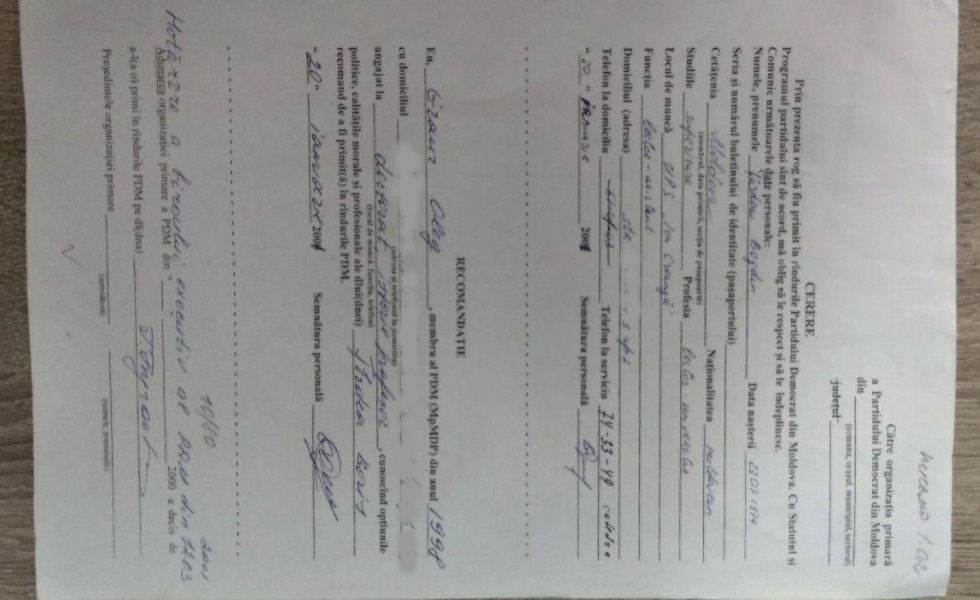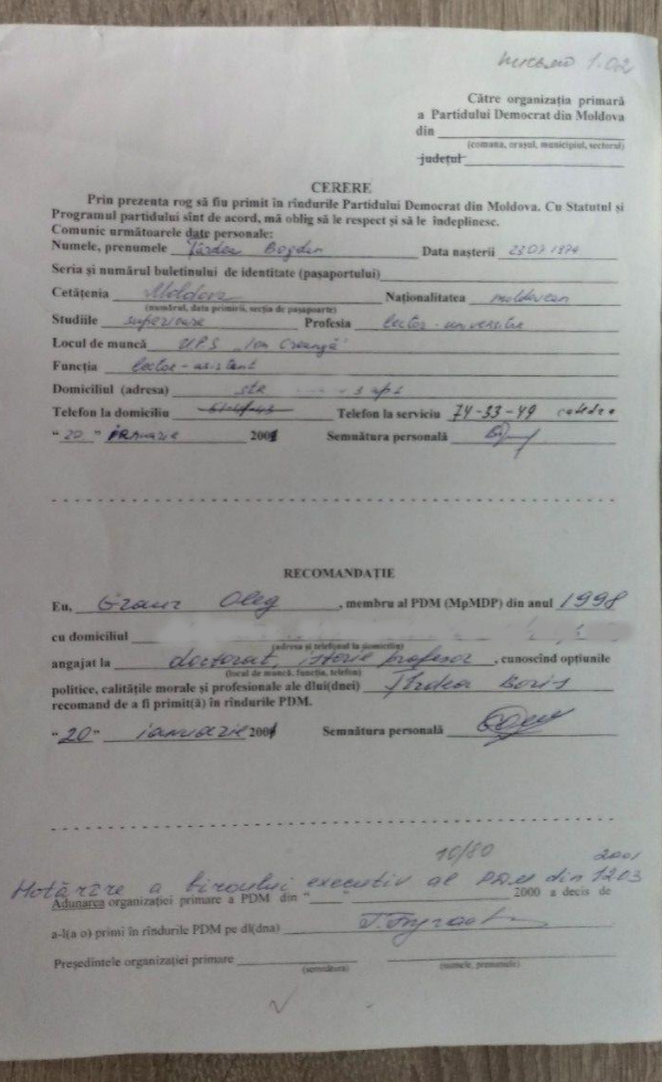 Conform cererii sale, lectorul Bodan Țîrdea de la Universitatea Pedagogică „Ion Creangă” se arăta de acord cu Programul Partidului Democrat și se obliga să-l respecte și să-l îndeplinească.