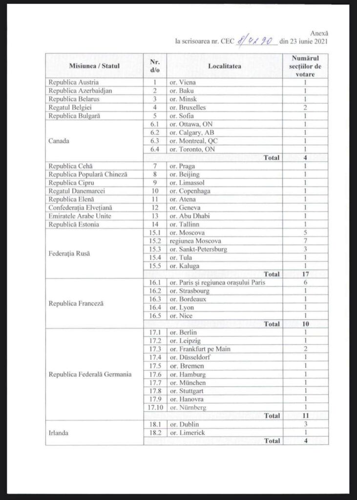 În rezultat, cu acordul Ministerul Afacerilor Externe și Integrării Europene, a fost aprobată, cu votul unanim al membrilor Comisiei, lista secțiilor de votare în străinătate pentru alegerile parlamentare anticipate din 11 iulie 2021, iar Consiliul electoral al circumscripției electorale pentru secțiile de votare constituite în străinătate nr. 38 va ajusta hotărârea privind constituirea birourilor electorale ale secțiilor de votare în străinătate în corespundere cu hotărârea CEC.