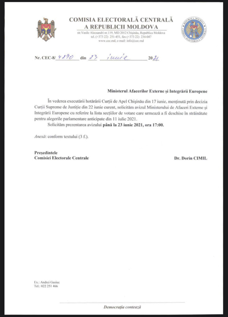Având la bază hotărârea Curții de Apel Chișinău din 17 iunie și a decizia Curții Supreme de Justiție din 22 iunie curent, Comisia Electorală Centrală (CEC) a organizat consultări suplimentare cu factori de decizie din cadrul Ministerului Afacerilor Externe și Integrării Europene (MAEIE).