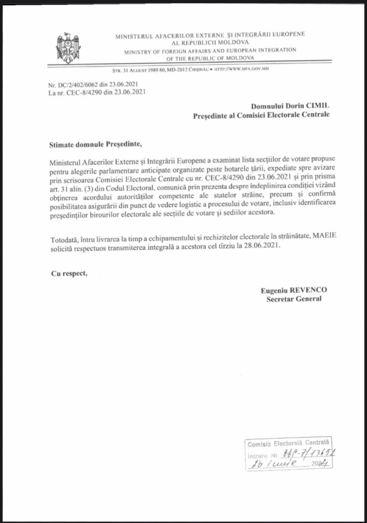 Având la bază devizul de cheltuieli estimativ pentru organizarea și desfășurarea alegerilor parlamentare anticipate din 11 iulie 2021 întocmit în baza evaluării necesităților pentru 150 secții de votare, CEC a transmis spre avizare finală MAEIE o listă, la fel, cu 150 secții de votare. Scrisoarea a fost semnată de către Dorin Cimil, președintele autorității electorale, ajuns în funcție la propunerea și cu susținerea PAS.