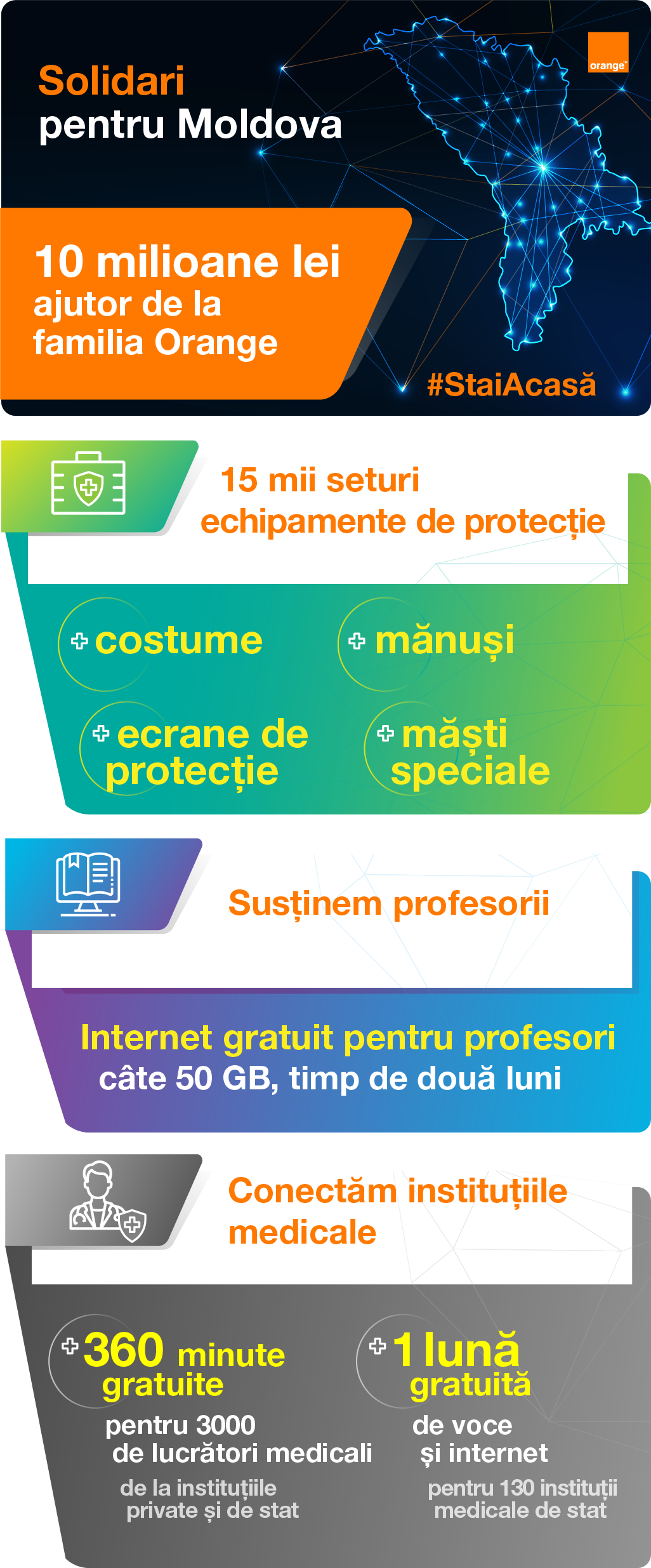 „Împreună cu echipa, din primele zile a apariţiei pericolului cauzat de COVID-19, lucrăm pentru a reitera că suntem solidari cu MOLDOVA. Astăzi anunţăm că implicarea Orange pentru a susţine sistemul medical şi cel educaţional, în special medicii şi profesorii, se estimează la 10 milioane de lei. 8 milioane din 10 vor fi direcţionate pentru achiziţionarea a circa 15 mii de seturi de echipamente de protecţie pentru medici. În această perioadă viabilitatea şi buna funcţionare a sistemului ocrotirii sănătăţii este una crucială pentru viitor. Încă două milioane de lei vor fi alocate sub formă de servicii de comunicare. Orange va continua să urmărească evoluţia situaţiei şi să rămână solidară pe toată durata acestei pandemii”.