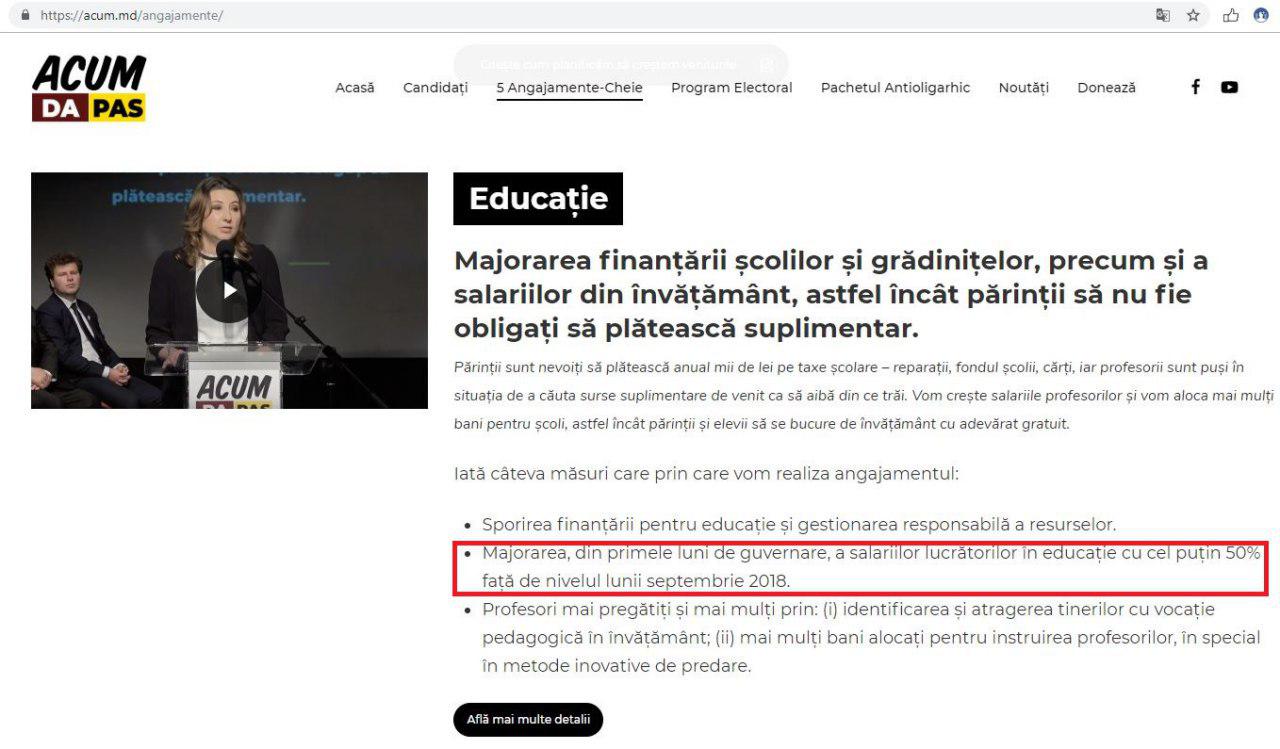 Partidele PAS și Platforma DA se obligaseră „să majoreze salariile lucrătorilor din educație cu minim 50% din primele luni după venirea la guvernare„ (vedeți dovada mai jos). Au trecut aproape două luni de când Maia Sandu este premier, însă salariile profesorilor nu au fost majorate nici măcar cu 1%. Probabil cei din blocul ACUM au uitat cele promise cetățenilor, sau mai rău – ei nu sunt în stare să realizeze ceea ce și-au pus în plan. Una este să vrei, alta este să poți.