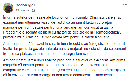 Astfel că Igor Dodon a dispus efectuarea unei analize profunde a situației ce s-a creat. Reprezentanții companiilor „Termoelectrica” și „Moldova-Gaz” au dat asigurări că factura pentru februarie o să fie cu 25-30 % mai mică comparativ cu cea a anului trecut și cu cea a lunii precedente. Tototodată, s-a subliniat că în caz contrar se va recurge la demiterea conducerii ”Termoelectrica”.