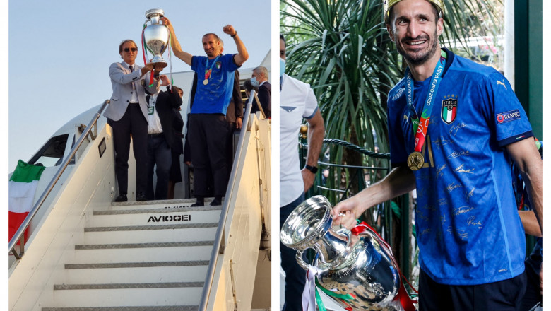 Selecţionerul Roberto Mancini a coborât din aeronava care a transportat Squadra Azzurra ţinând în braţe preţiosul Trofeu Henri Delaunay, atribuit campionilor europeni, urmat de ceilalţi componenţi ai delegaţiei italiene.