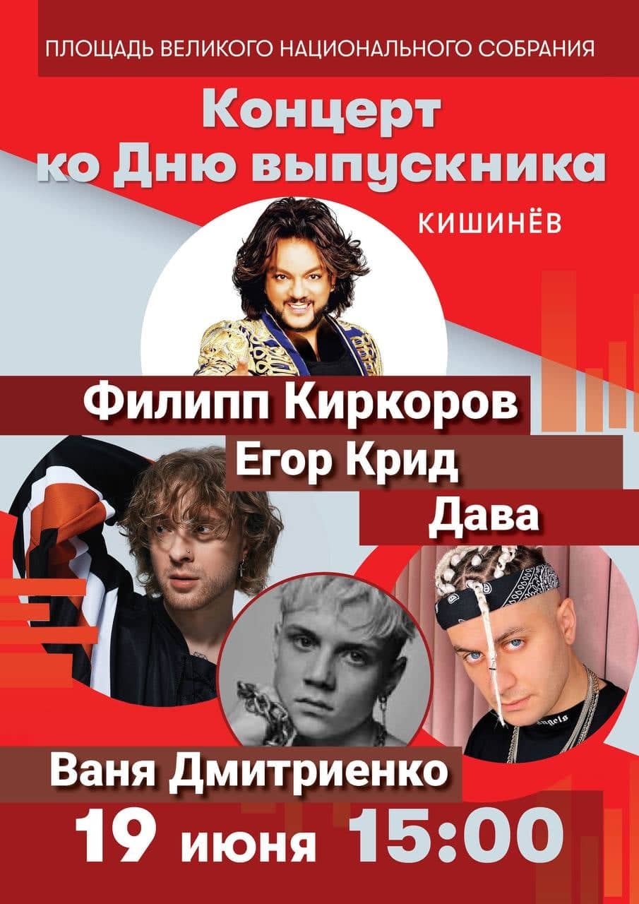 Pe lângă interpretul Egor Kreed, va încânta publicul cu melodiile preferate regele muzicii pop din Rusia, Filip Kirkorov, precum și cântăreții Dava și Vanea Dmitrienko. Ultimii au ajuns la Chișinău sâmbătă dimineața. Atât interpreții ruși, cât și organizatorii promit un eveniment de excepție, unde vor fi surprize de neuitat. Intrarea e liberă pentru toți doritorii.