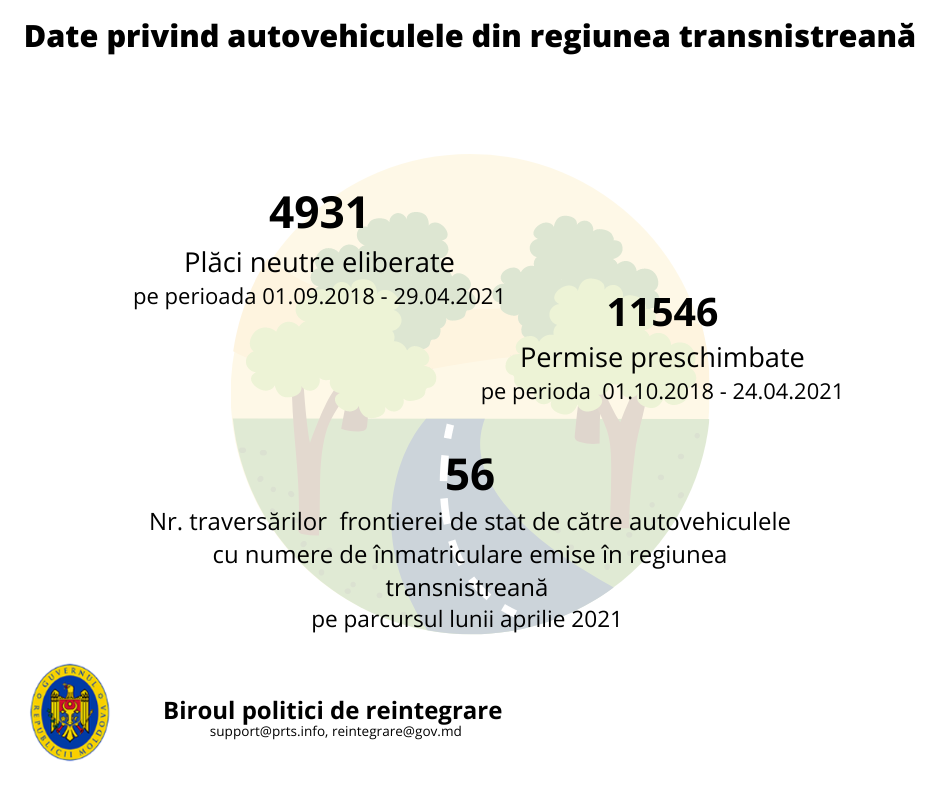 Iar în perioada 01.09.2018 – 29.04.2021 potrivit acelorași date din Registrul de stat al transporturilor, în subdiviziunile din or. Tiraspol și or. Rîbniţa au fost înmatriculate cu plăci neutre 4931 de vehicule (Tiraspol-3649, Rîbnița-1282), inclusiv 225 au fost documentate în luna martie curent și 173 în perioada 01-29.04.2021.