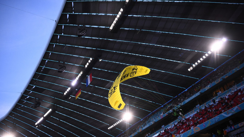Două persoane au fost rănite înaintea meciului Germania-Franța de la EURO 2020, după ce un protestatar Greenpeace care zbura cu parapanta s-a încurcat în cablul unei camere suspendate de pe stadion și a fost la un pas să se prăbușească în tribune, informează BBC. În final, acesta a reușit să aterizeze forțat pe teren.