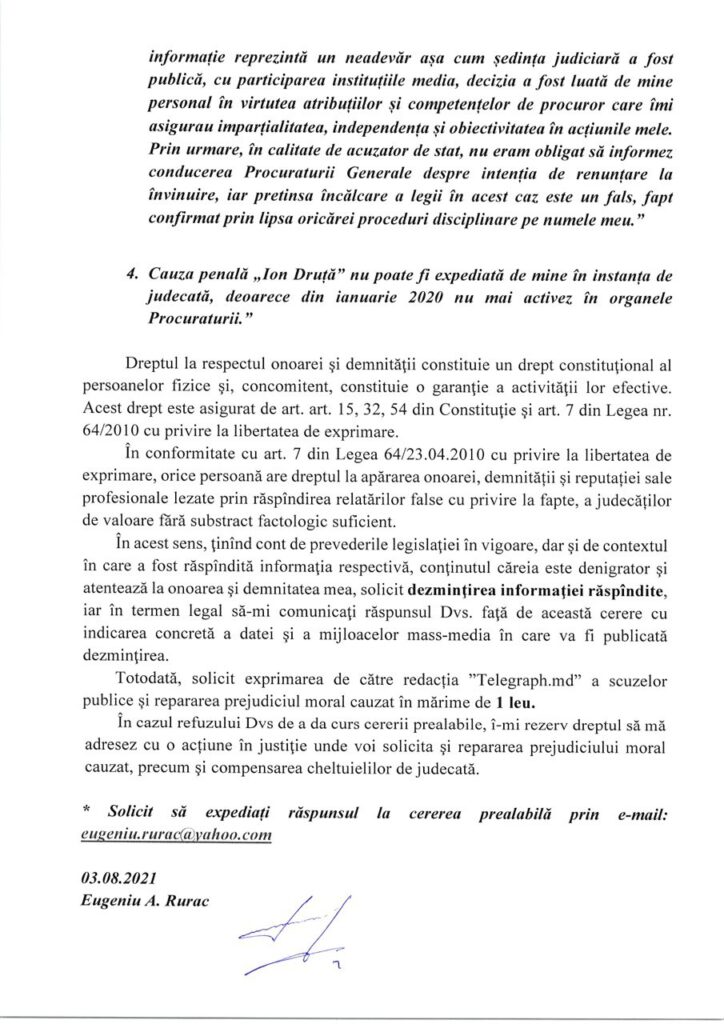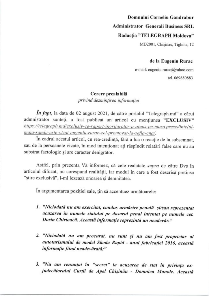 Publicăm cererea prealabilă și subliniem faptul că Președinția a refuzat dă ne comunice dacă Eugeniu Rurac a activat în cadrul Aparatului, pentru a putea să-l contactăm.