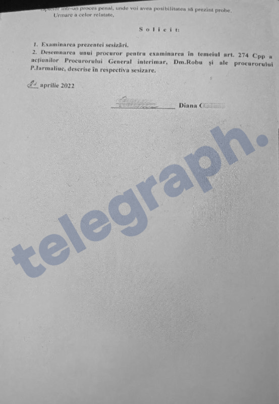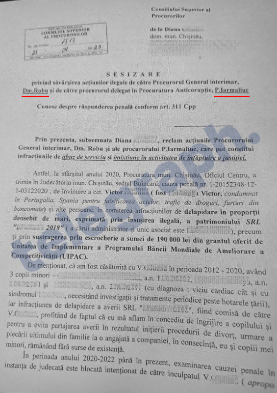 Diana ***, mamă a trei copii minori, cere Consiliului Superior al Procurorilor desemnarea unui procuror care să examineze faptele săvârșite de către actualul procuror general interimar, Dumitru Robu, și procurorul Petru Iarmaliuc, pentru abuz de serviciu și imixtiune în activitatea înfăptuirii justiției, și anume pentru protecția acordată unui moldovean condamnat în Spania pentru fals în acte, trafic de droguri și furturi din bancomate, acuzat și judecat în Moldova pentru delapidarea averii și escrocherie.