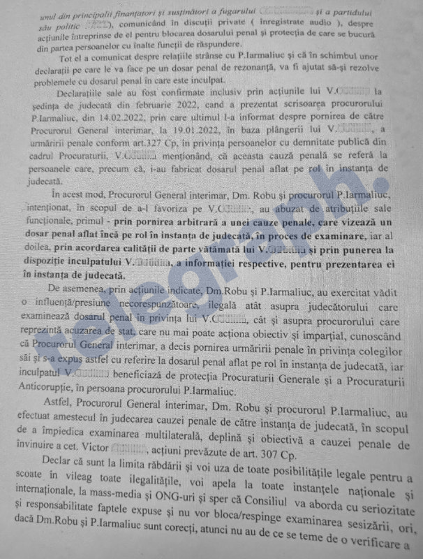 ”De asemenea, prin indicate, Robu și Iarmaliuc, au exercitat vădit o influență/presiune necorespunzătoarea, ilegală atât asupra judecătorului care examinează doarul penal în privința lui Victor ****, cât și asupra procurorului care prezintă acuzarea de stat, care nu mai poate acționa obiectiv și imparțial cunoscând că Procurorul general interimar, a decis pornirea urmăririi penale în privința colegilor său și s-a expus astfel cu referire la dosarul penal aflat pe rol în instanța de judecată, iar inculpatul Victor **** beneficiază de protecția Procuraturii Generale și a Procuraturii Anticorupție, în persoana procurorului P. Iarmaliuc”, mai susține femeia, menționând că în acest fel Robu și Iarmaliuc au efectuat amestecul în judecarea cauzei penale de către instanța de judecată, în scopul împiedicării examinarea multilaterală, deplină și obiectivă a cauzei penale de învinuire a cetățeanului Victor ****, acțiuni prevăzute la art.307 Cod penal.