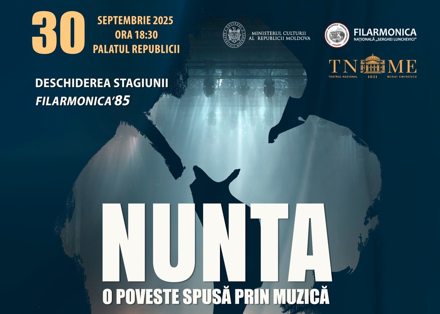 Filarmonica Națională ”Serghei Lunchevici” marchează în 30 septembrie, deschiderea noii stagiuni aniversare prin concertul intitulat ”Nunta – o poveste spusă prin muzică”. Evenimentul va avea loc la ora 18:30, la Palatul Republicii.