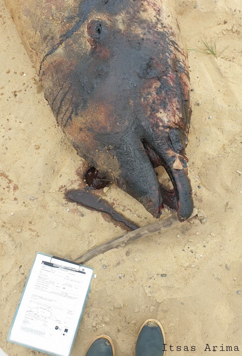 Cadavrul balenei, care a fost găsit în stare de descompunere sâmbătă pe o plajă de nişte trecători, a fost apoi disecat de doi membri ai reţelei naţionale pentru monitorizarea animalelor eşuate din cadrul Observatorului Pelagis.