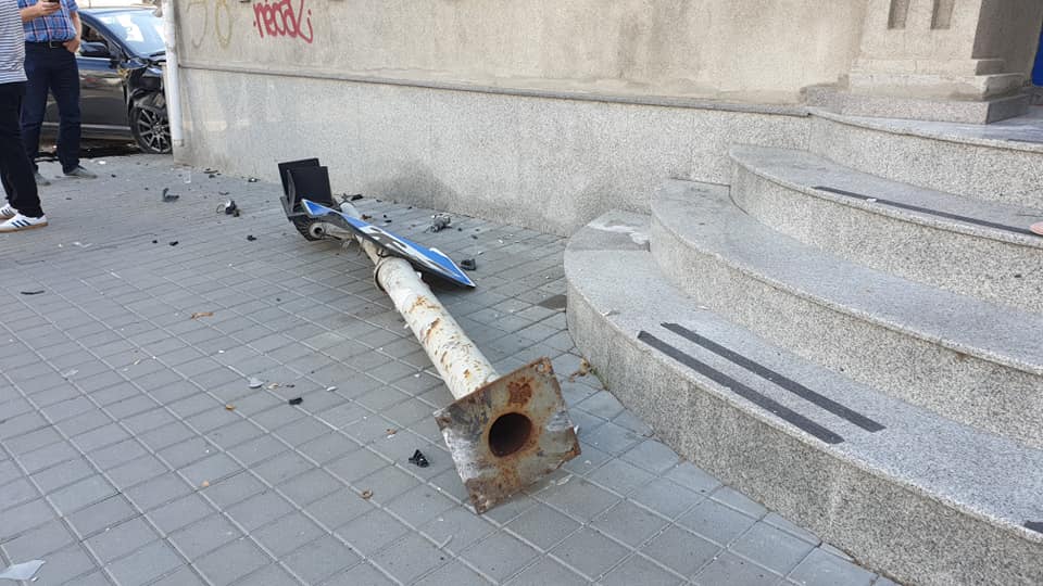 Vedeți aici impactul unui accident de acum 30 min., s-a rupt pilonul cu semafor și a fost aruncat puternic în pragul oficiului unde ne aflăm noi.