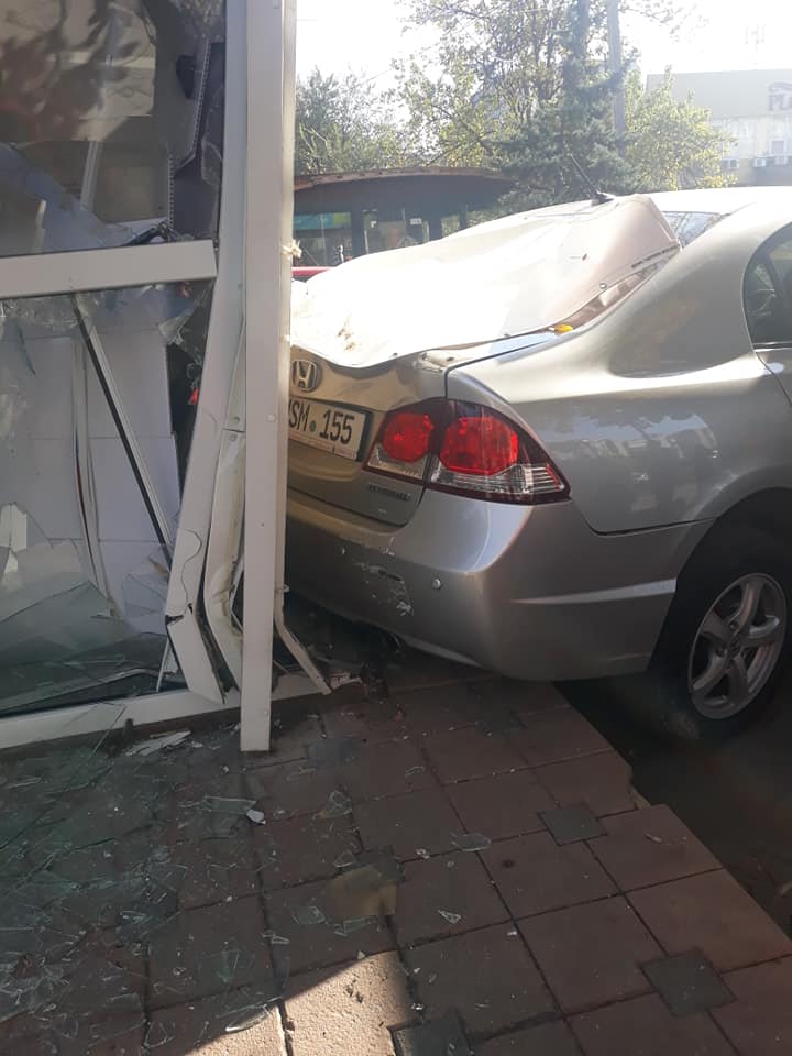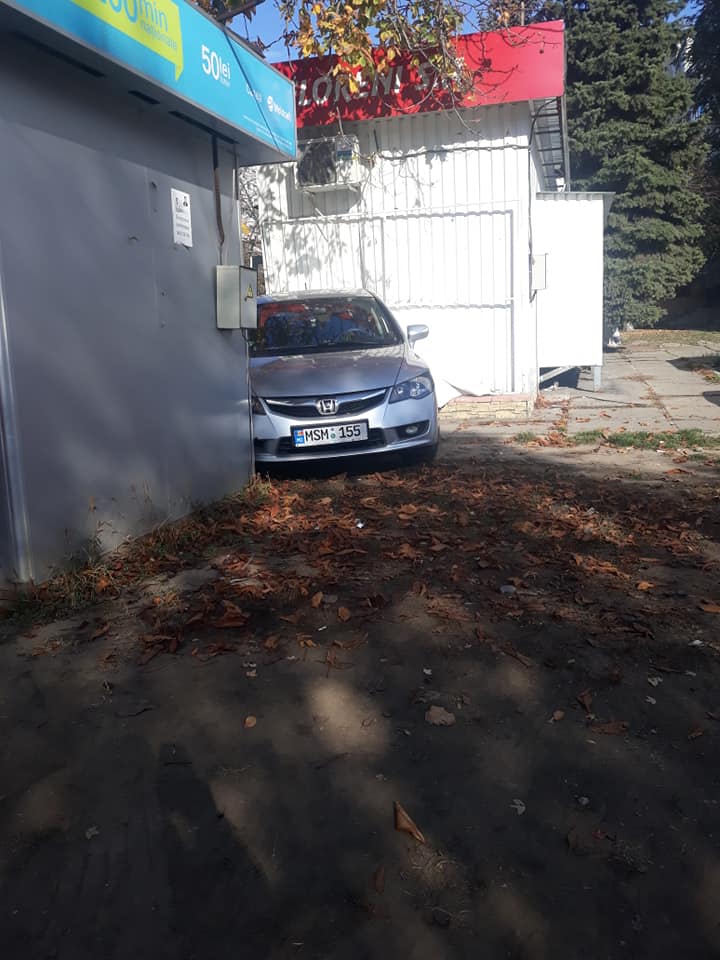 Din poză se vede cum un automobil de model Honda, a ajuns la propriu cu portbagajul mașinei pătruns prin peretele unei gherete de pe marginea drumului.