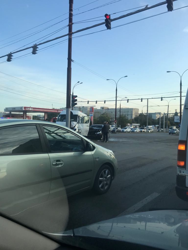 Accident matinal la intrarea în Chișinău. Un microbuz de linie ce transporta pasageri a lovit puternic un semafor, după ce un automobil de marca Mercedes a intrat în el.