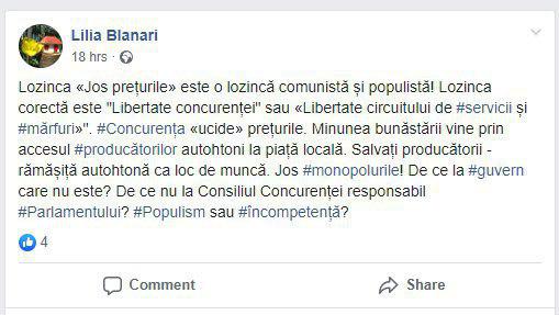 Lilia Blanari, persoana care a postat acest mesaj pe peretele evenimentului organizat de blocul ACUM, a îndemnat organizatorii să folosească lozinca corectă, care ar trebui să fie „Libertate Concurenței” sau „Libertate circuitului de servicii și mărfuri”, pentru că anume concurența „ucide” prețurile.
