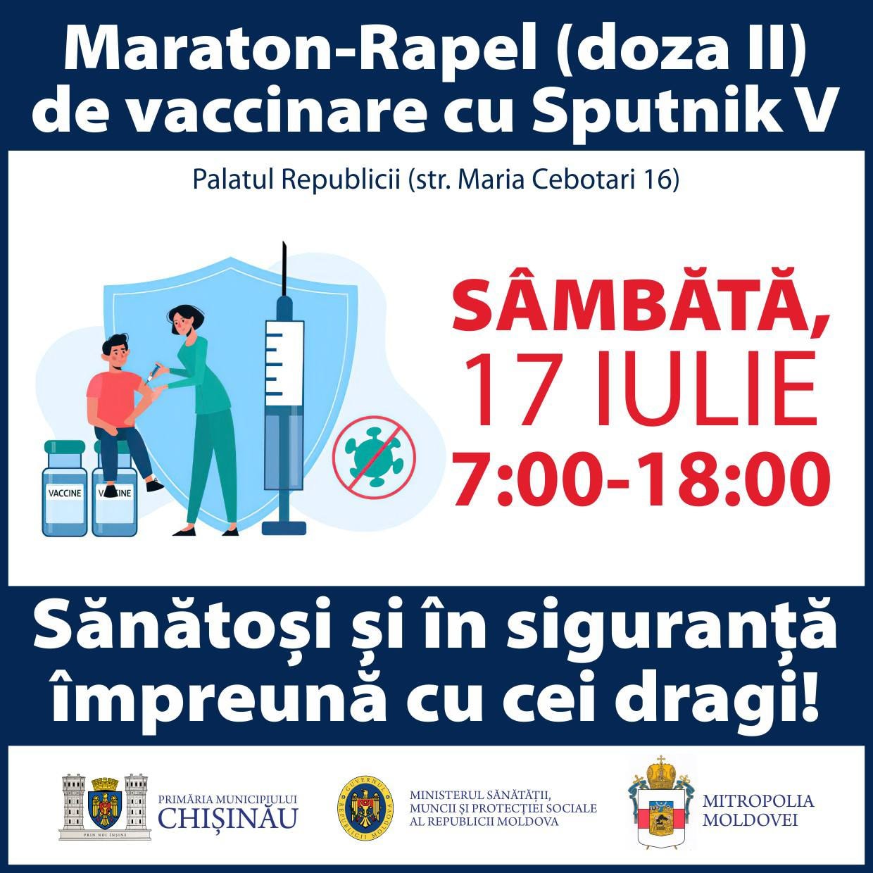 Sâmbătă, 17 iulie, curent între 7:00-18:00, la Palatul Republicii va fi organizat maratonul-rapel cu Sputnik V pentru persoanele care au primit prima doză pe 26 iunie.