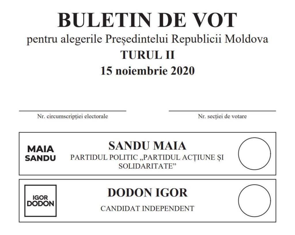 Comisia Electorală Centrală (CEC) a aprobat textul şi modelul buletinului de vot pentru turul al doilea de scrutin din 15 noiembrie 2020. Acesta va conține 2 patrulatere, având lungimea de 112 mm și lăţimea de 140 mm și se va tipări pe hârtie opacă (mată) de culoare gri afumat.