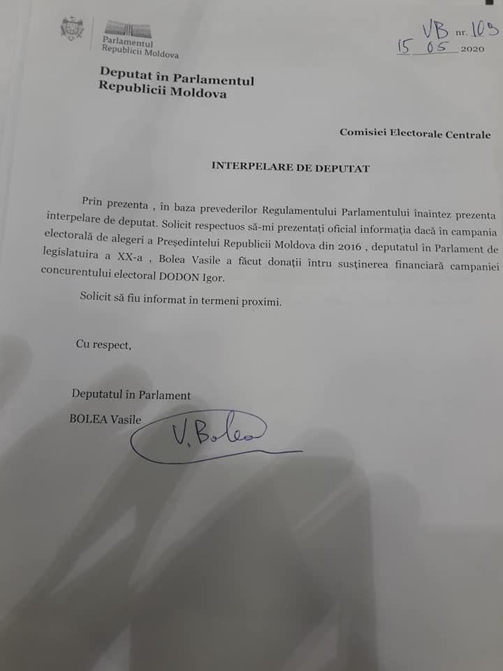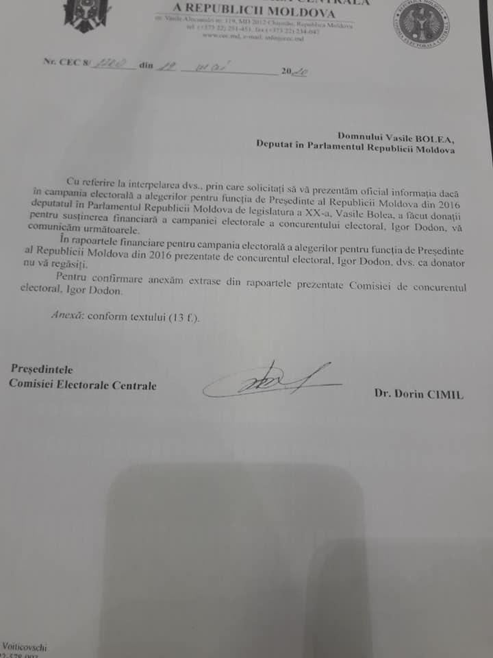 Ca și răspuns la interpelarea mea, CEC a dat un răspuns ferm că am figurat în calitate de donator pentru campania electorală prezidențială a domnului IGOR DODON.
