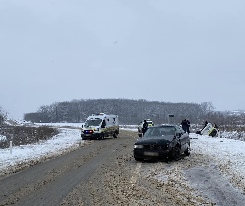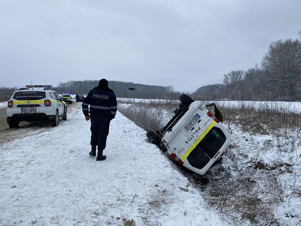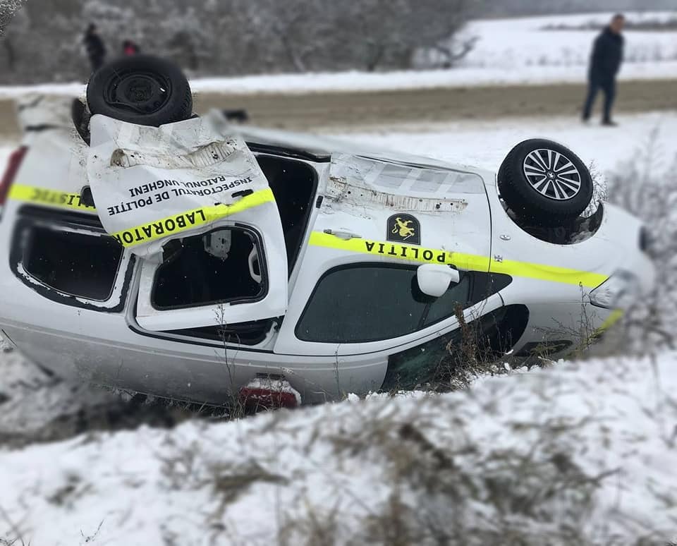 În această dimineață pe traseul Chișinău – Ungheni între localitățile Sipoteni și Bahmut, raionul Călărași, o mașină a poliției a fost implicată într-un accident rutier, fiind lovită de un alt autoturism de marcă Audi al cărui șofer nu a ținut cont de starea carosabilului și a tamponat lateral stânga mașina de poliție a IP Ungheni, care în urma impactului s-a răsturnat pe acostament într-un șanț.