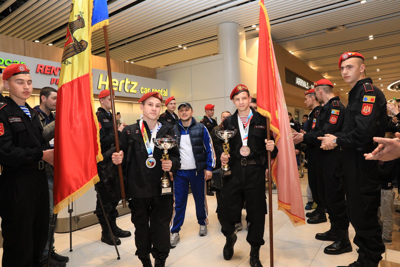 Ieri, 18 martie 2019, în sala de așteptare a aeroportului internațional Chișinau au fost întâmpinați cu drapelul de stat, sunete de fanfară, flori și multe aplauze sportivii Departamentului Trupelor de Carabinieri care au revenit acasă cu două medalii pentru Republica Moldova de la Campionatul European Under 22, desfășurat în Vladikavkaz (Federația Rusă).