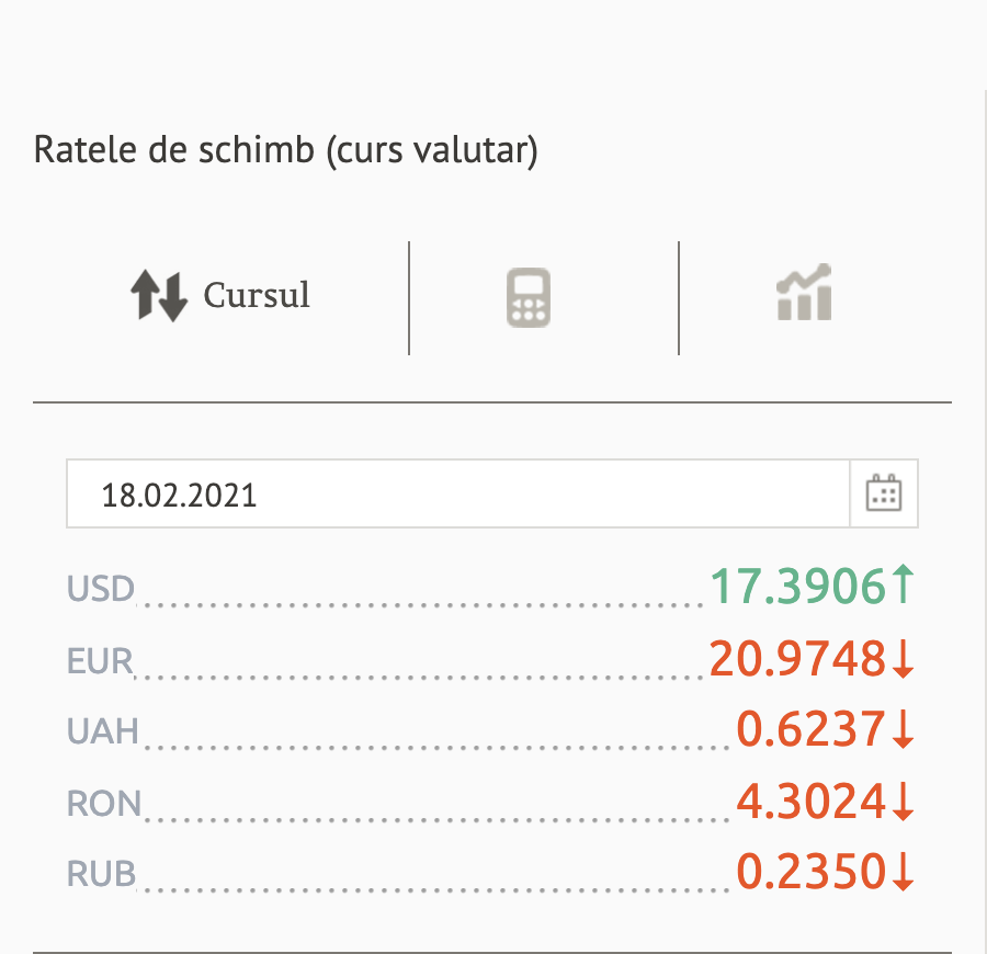La cursul Băncii Naționale a Moldovei (BNM) pentru joi, 18 februarie, un dolar american este cotat cu 17,39 lei, un euro – cu 20,97 lei, o hrivnă ucraineană – cu 62,37 bani, un leu românesc – cu 4,30 lei moldovenești, o rublă rusească – cu 23,50 bani.