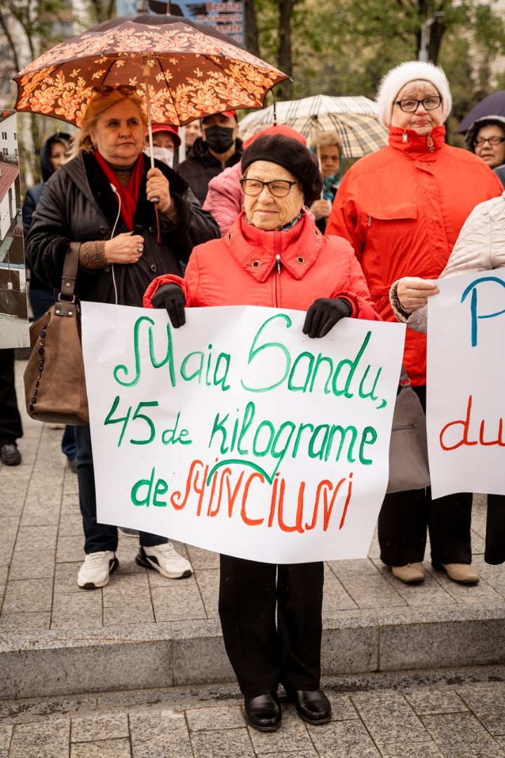 „De ce luați de la noi ca să vă majorați vouă salariile? De ce ați promis că veți aduce vremuri bune, dar trăim vremuri grele? Cerem să acordați o mai mare atenție poporului. Gândiți-vă la ceea ce faceți. Să nu credeți, Maia Sandu, că lucrurile vor putea continua astfel mult timp. Poporul își va face dreptate”, a spus o pensionară.