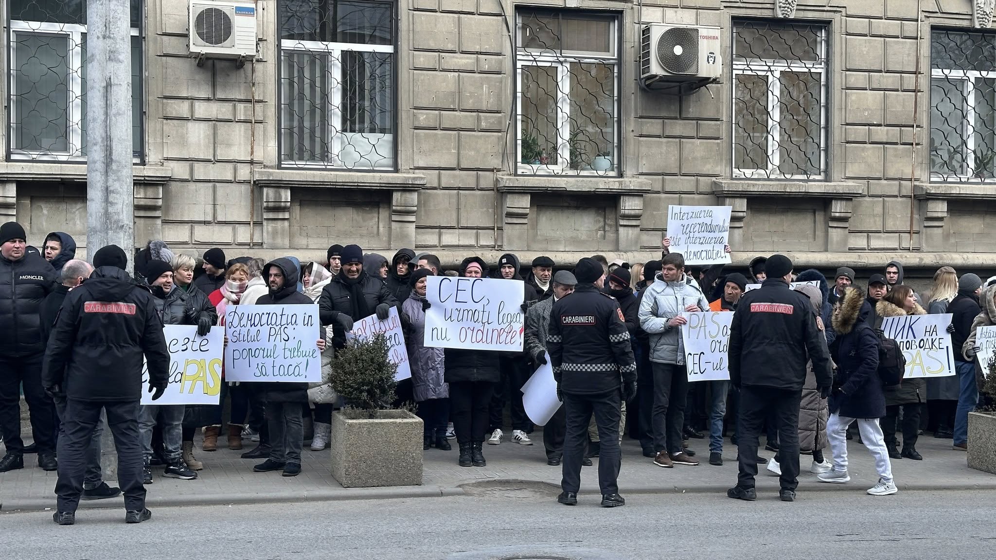 Protestatarii au scandat sloganuri și au ținut afișe cu inscripții: „CEC, urmați legea, nu ordinele!”, „PAS vrea în NATO, poporul vrea pace!”, „Interzicerea referendumului este interzicerea democrației!”, „Neutralitatea este alegerea poporului!”, „CEC este filiala PAS!” si altele.