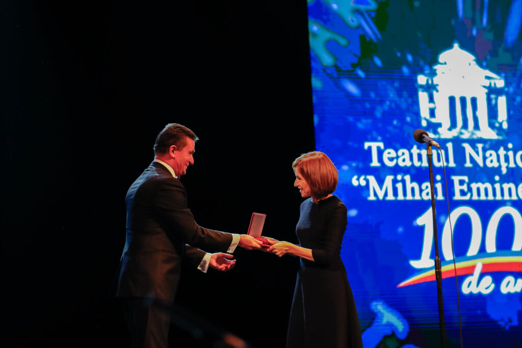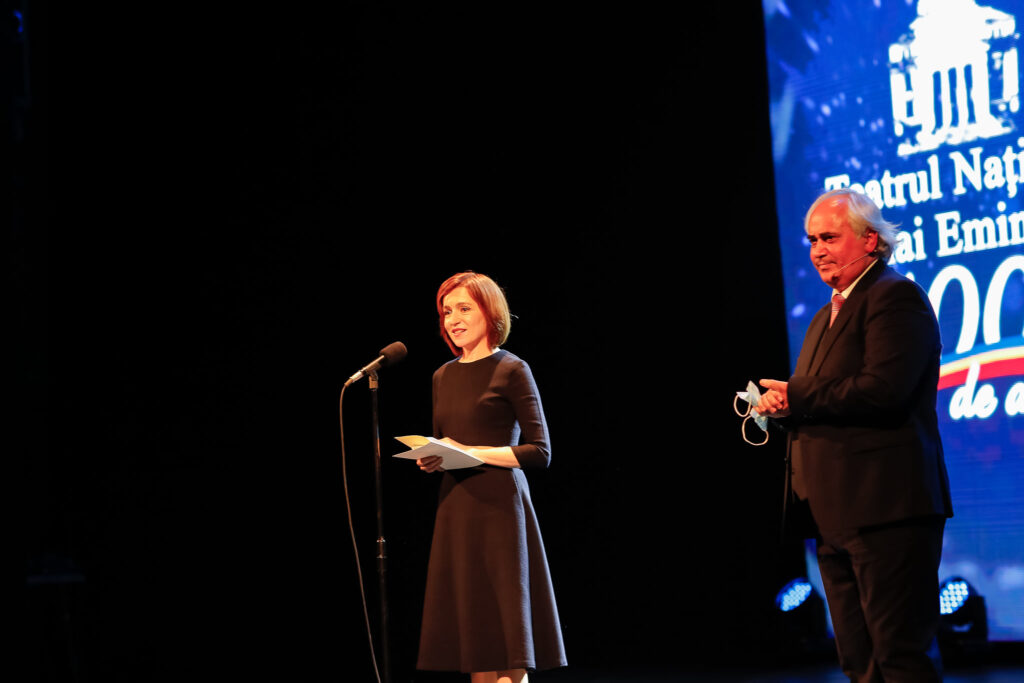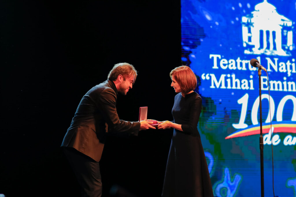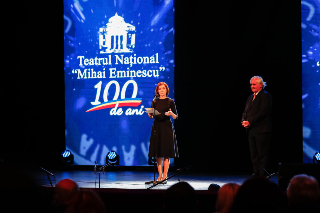 „Am urcat cu emoție, ieri, pe scena Teatrului Național „Mihai Eminescu” din Chișinău pentru a sărbători împreună cu actorii, regizorii, lucrătorii din spatele cortinei 100 de ani ai acestei instituții de cultură. Teatrul Național este un adevărat simbol al țării noastre și sunt onorată că evenimentele dedicate acestui jubileu se desfășoară sub egida Președinției Republicii Moldova. M-am bucurat că, la 27 martie, și Președintele Klaus Iohannis s-a alăturat acestei inițiative, prilej cu care, încă o dată, am mulțumit României pentru sprijinul acordat proiectelor culturale din Republica Moldova”, a spus Președinta Maia Sandu.