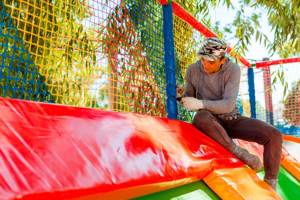 Parcul va fi dotat cu zeci de tobogane gonflabile, trambuline şi terenuri de joacă pentru copii.
