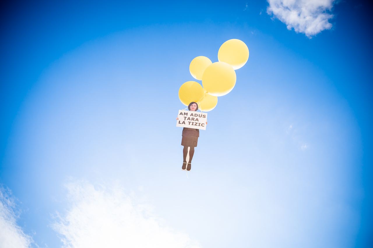 Maia Sandu a zburat la propriu din fața zecilor mii de protestatari, care au venit în Președinției să-i ceară demisia. De fapt, este vorba despre o machetă cu chipul președintelui care a fost legată de niște baloane galbene și lansată spre cer. Acțiunea s-a petrecut în aplauzele mulțimii care îi cerea Maiei Sandu să plece, alături de toată guvernarea PAS, și să fie organizate alegeri prezidențiale și parlamentare anticipate.