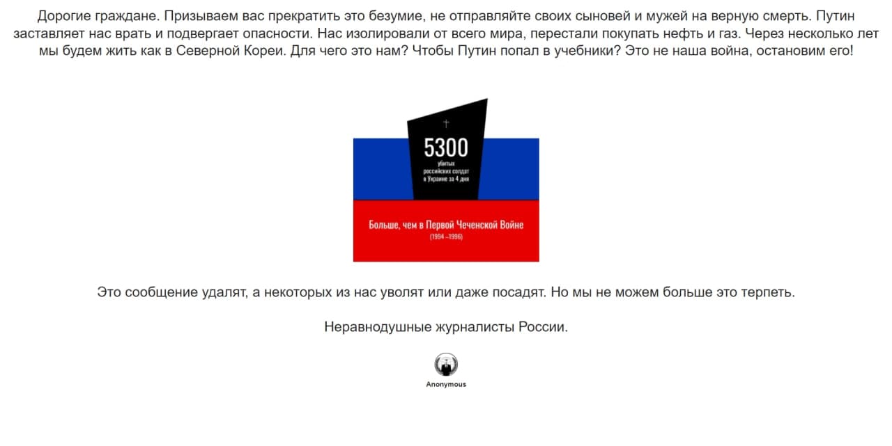 Site-urile ruse Kommersant, (”Коммерсантъ”), TASS (”ТАСС”), Izvestii (”Известий”), Lenta.ru (”Лента.ру”), Fontanka (”Фонтанка”), Buro 24/7, Mel (”Мел”) și Е1 au fost sparte de către gruparea de hackeri ”Anonymous”, transmite Telegraph.md